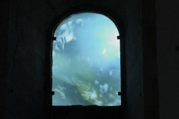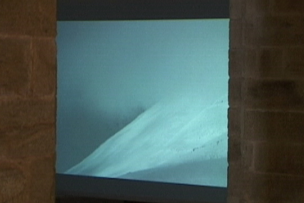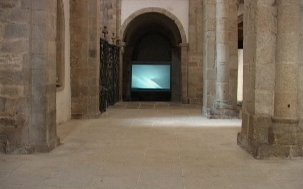 Above and inside the graves of two Spanish pilgrims a reproduction of a painting of a snowy hillside was installed. Then the church´s north window was covered by a transparent film with a detail of one of the painted hillsides printed on it, giving an imaginary view all the way to Iceland. In another wing of the church the video Fog of foggy hillsides was displayed. The music composed by Dagur Kari for the film, provided a modern but still a harmonious ambiance in the medieval building.