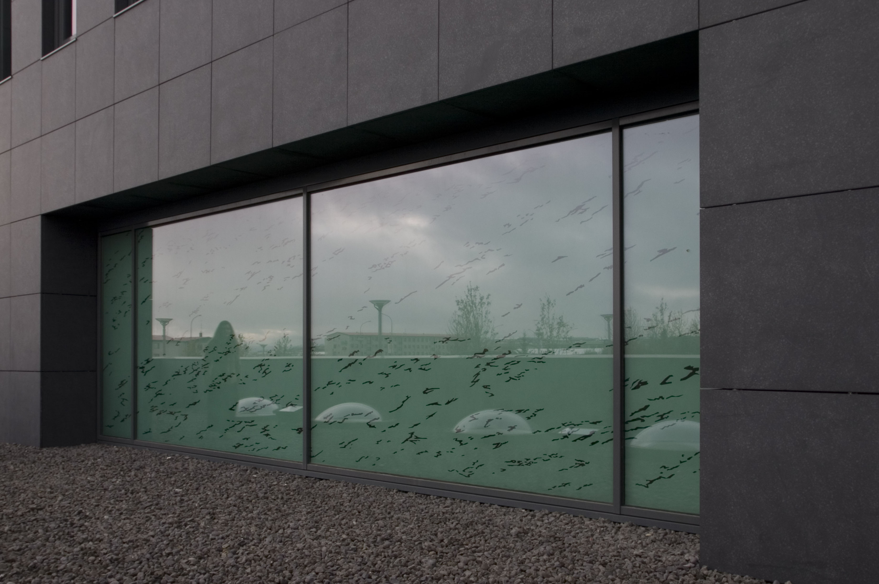 Installation composed of an oil pigment painted on glass 2.50 x 8 m, a pseudo-reflection painted on an opposide wall and a video from within an old house.