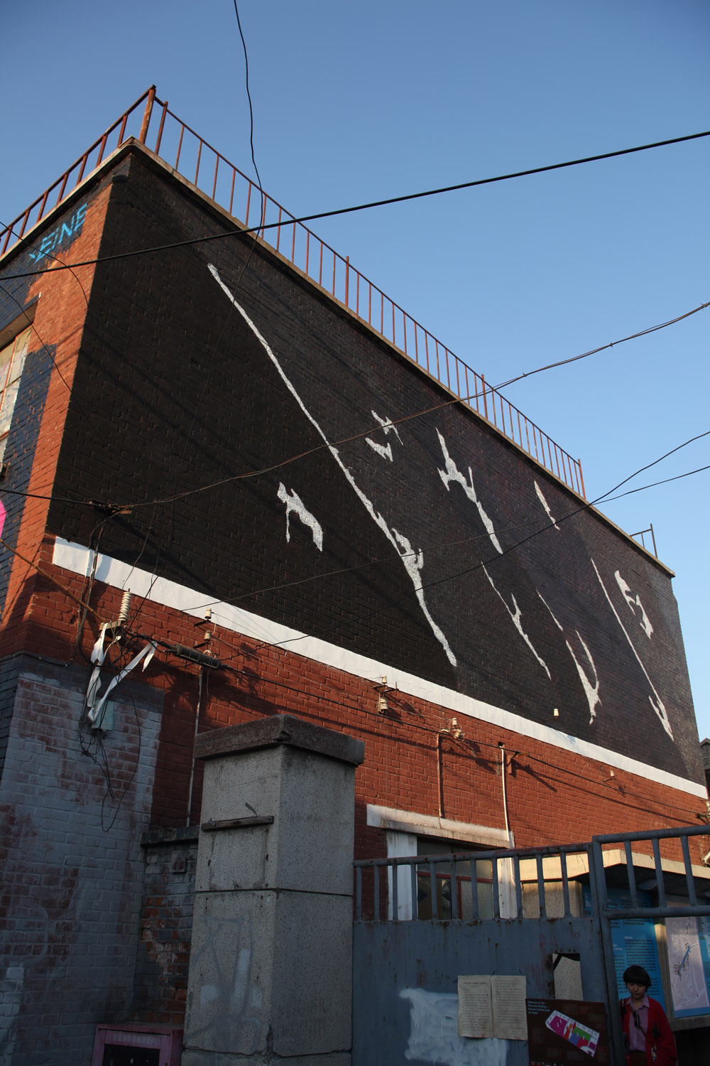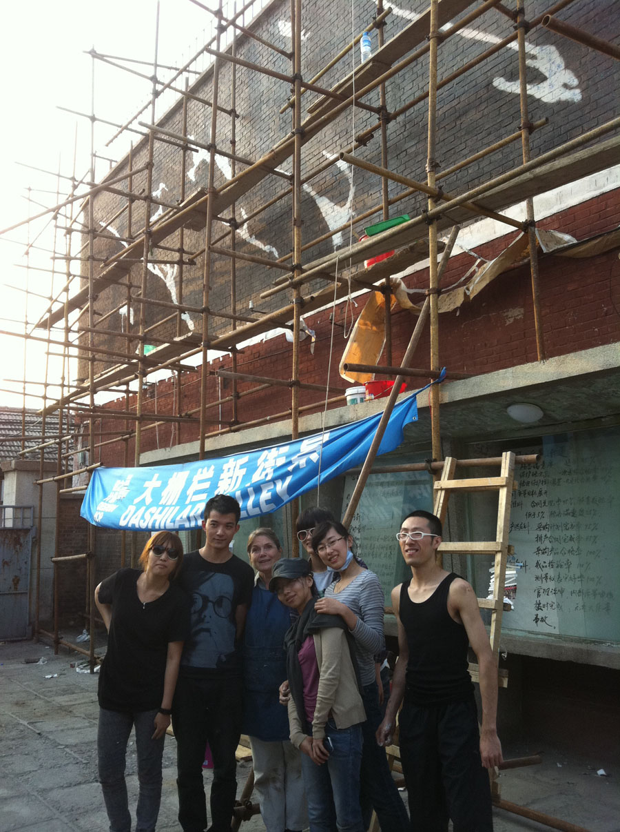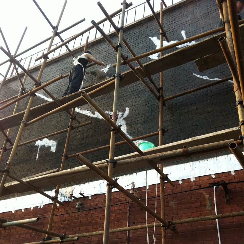 Gudrun has named the project THE WALL –local collaboration and mural installation with Icelandic volcanic ash and Chinese broken glass. In the art piece, shapes appear similar to those when snow white glacial cracks open under a blanket sheet of black ash. The factory wall rises above the traditional Beijing one level cobblestone courtyard houses and faces south. When the sun shines on the wall, the fragments of glass will glitter among light absorbing black volcanic ash.